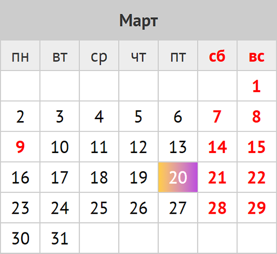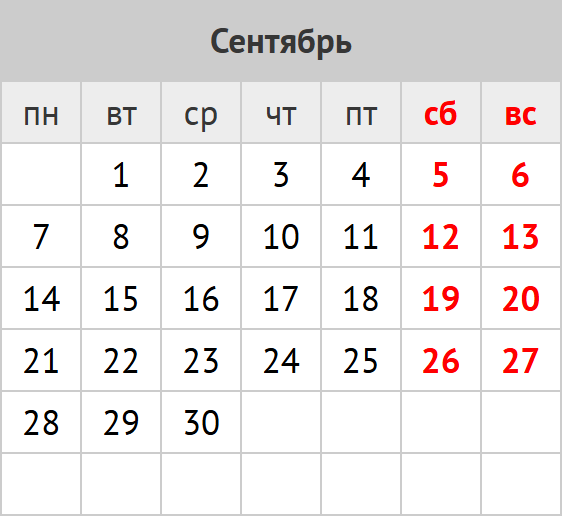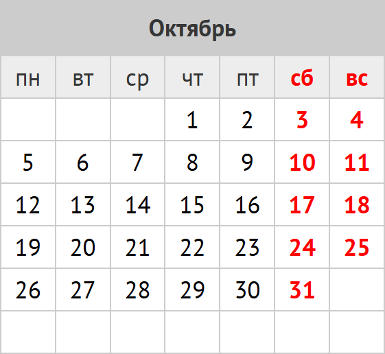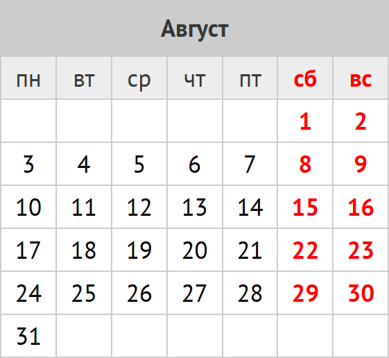 количество дней: календарных 30; рабочих 20; выходных и праздников 10