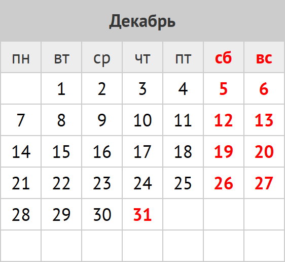 количество дней: календарных 31; рабочих 19; выходных и праздников 12