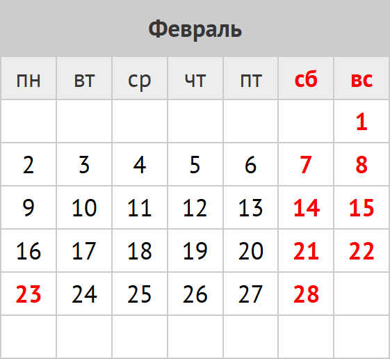 количество дней: календарных 28; рабочих 19; выходных и праздников 9