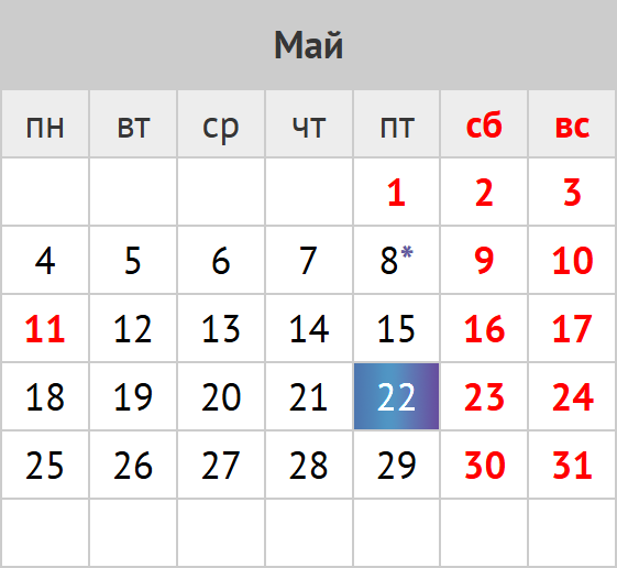 количество дней: календарных 30; рабочих 22; выходных и праздников 8